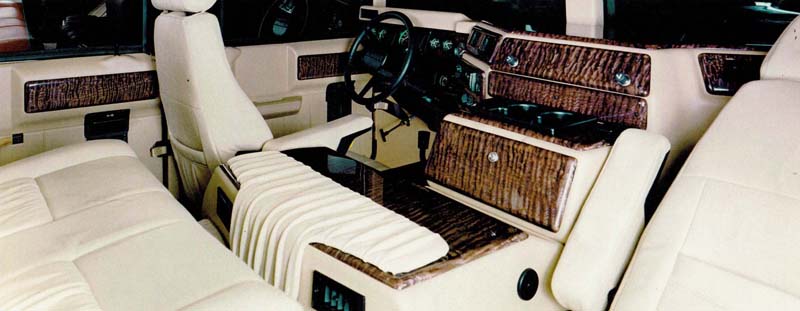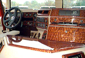 This picture is of a later model, veneered in Burled Walnut. (sorry, but the camera flash made the Burled Walnut look redder that it normally is) If you look carefully, you can see our woodwork on the door panel of the open passenger door. We offer wood panels for each of the doors, as an option and most folks purchase them. |