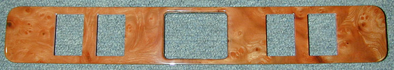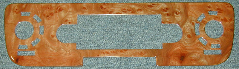 Below is the rest of woodwork from the Jaguar XJS that you saw on our Jaguar Main Page. Some years of XJS originally had a vinyl covered Radio Panel, and a vinyl covered Shift Console Panel. We are able to veneer those parts and our customer requested we do that for his set. We also modified the shift console panel per his request and then Reveneered & Refinished all of the set for our customer. |